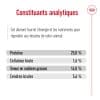 CONSTITUANTS ANALYTIQUES : Protéine : 25,0 % – Cellulose brute : 1,6 % – Teneur en matières grasses : 14,0 % – Cendres brutes : 5,6 %.
